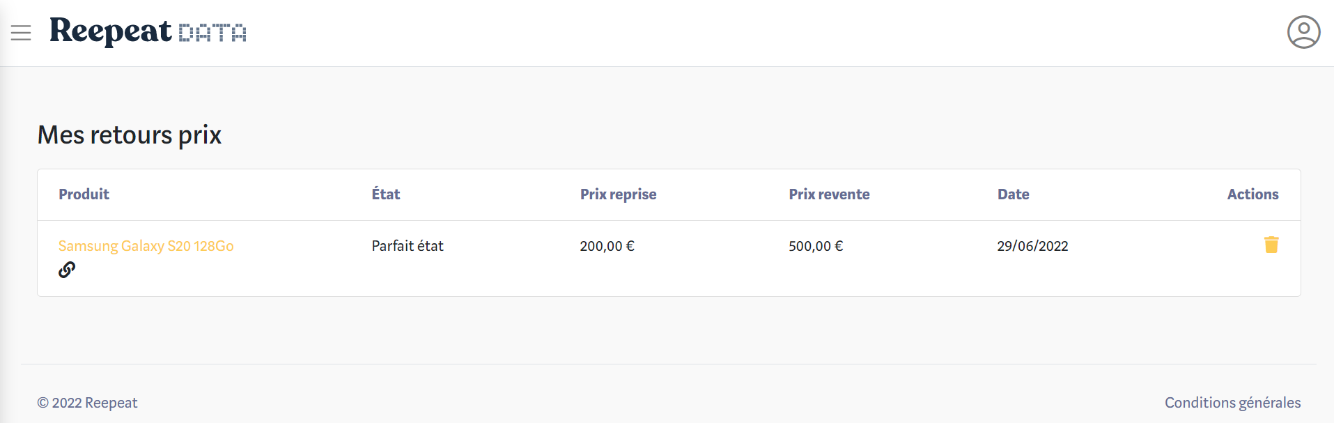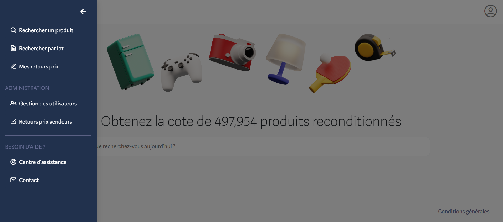 Lorsque vous êtes connecté, vous pouvez rechercher la côte d’un produit reconditionné. Cette page est également accessible en cliquant sur le lien “Rechercher un produit” dans le menu qui s’ouvre lorsque vous cliquez sur en haut à gauche. Le moteur ...