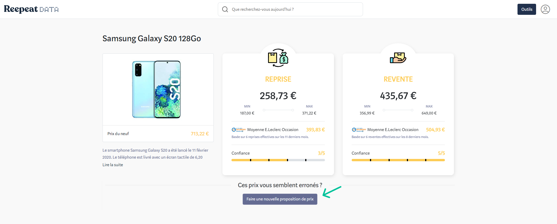 Lorsque vous avez trouvé le produit que vous recherchez, vous arriverez sur la fiche produit, qui contient plusieurs informations. Bloc produit : nom, photo, prix du neuf et description du produit Côte de reprise : Il s’agit du prix moyen que nous ...