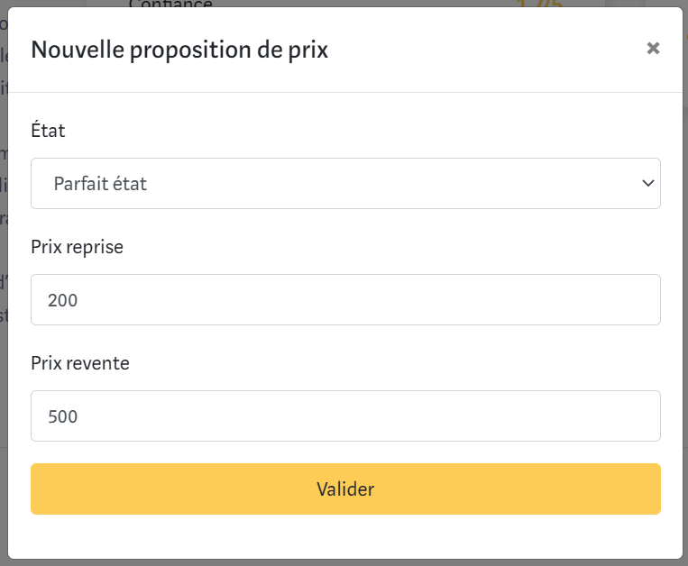 Pour faire une nouvelle proposition de prix, vous devez choisir l’état puis renseigner le prix de reprise et le prix de revient que vous proposez.