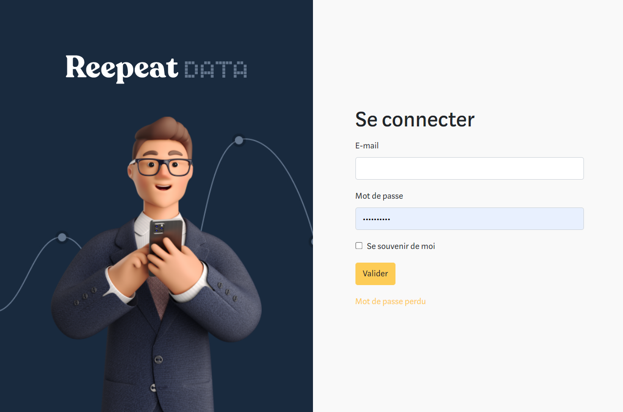 Pour vous connecter sur Reepeat Data, rendez-vous sur https://data.reepeat.fr puis saisissez votre adresse e-mail puis votre mot de passe.